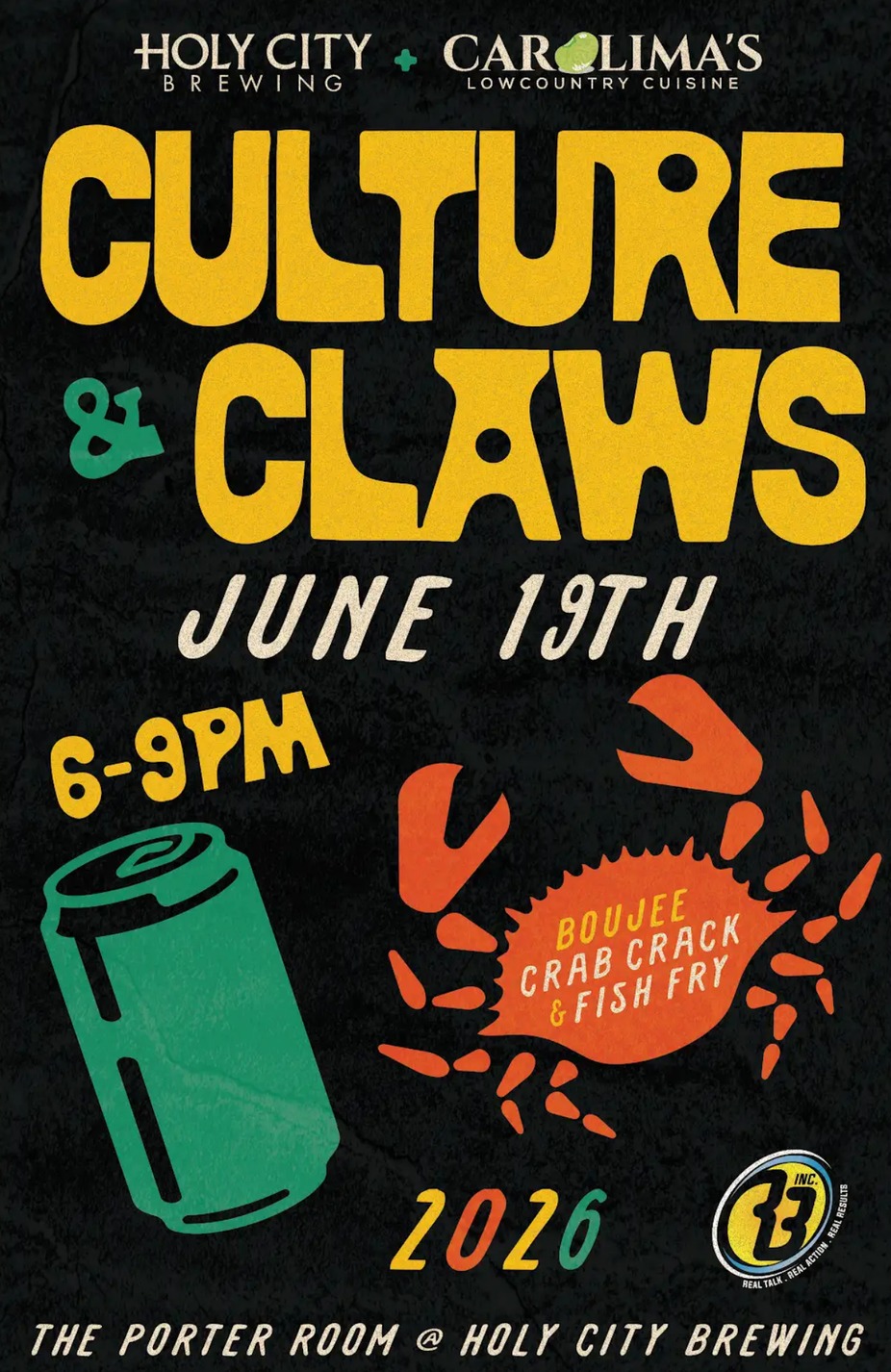 Culture and Claws brings together the best of Charleston’s culinary and social scenes for a night that is as soulful as it is sophisticated. Join us at the Porter Room at Holy City Brewing for an elevated coastal experience you won’t want to miss.